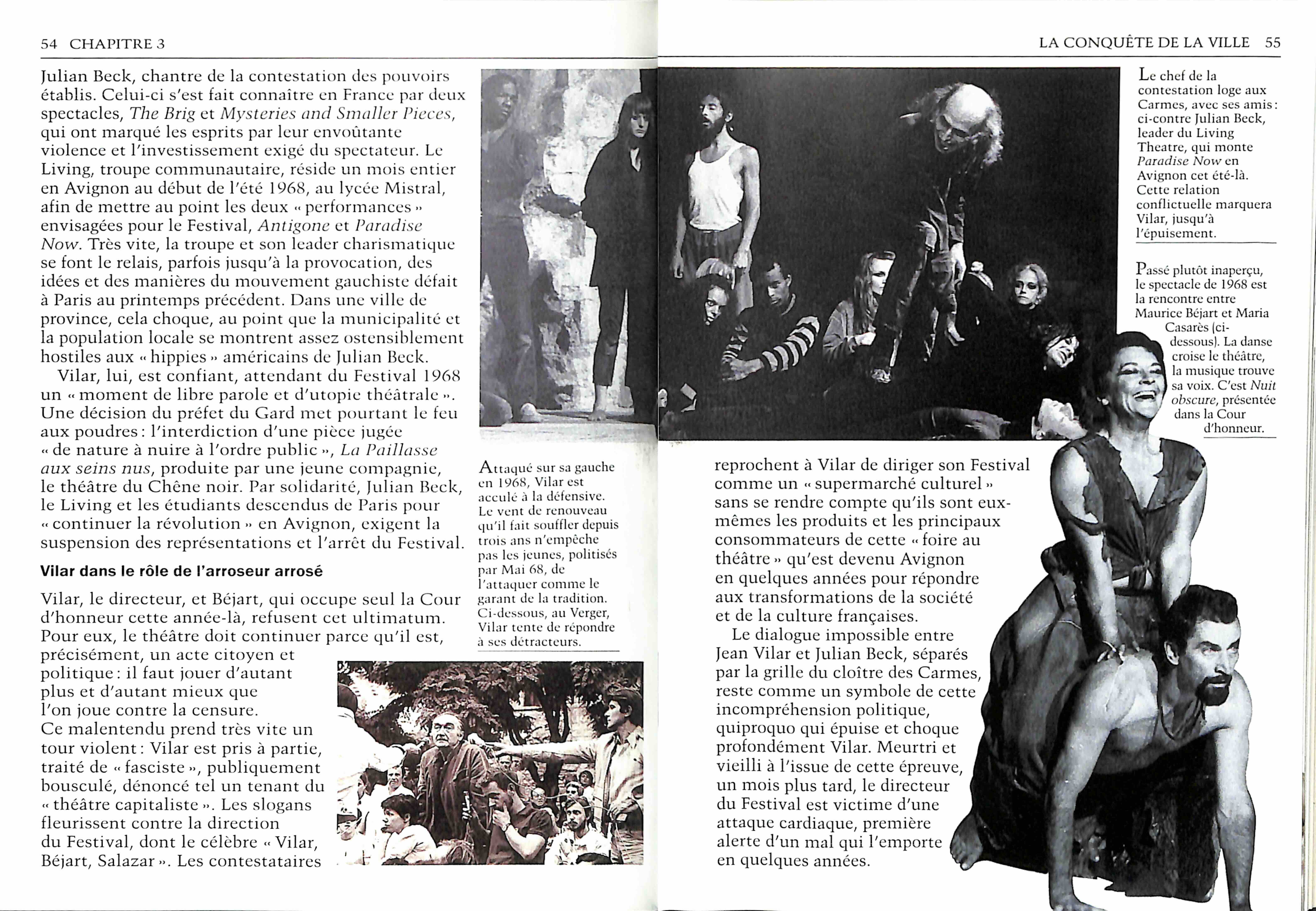 « La conquête de la ville »1963, Vilar quitte le TNP et se consacre au Festival : nouveaux espaces scéniques, arrivée de jeunes metteurs en scène, ouverture à d'autres disciplines ...1968, la révolte de mai se prolonge l'été en Avignon. Villar est vivement contesté ; il décède en 1971. Paul Puaux prend sa relève, le Festival « off" secret. pg44