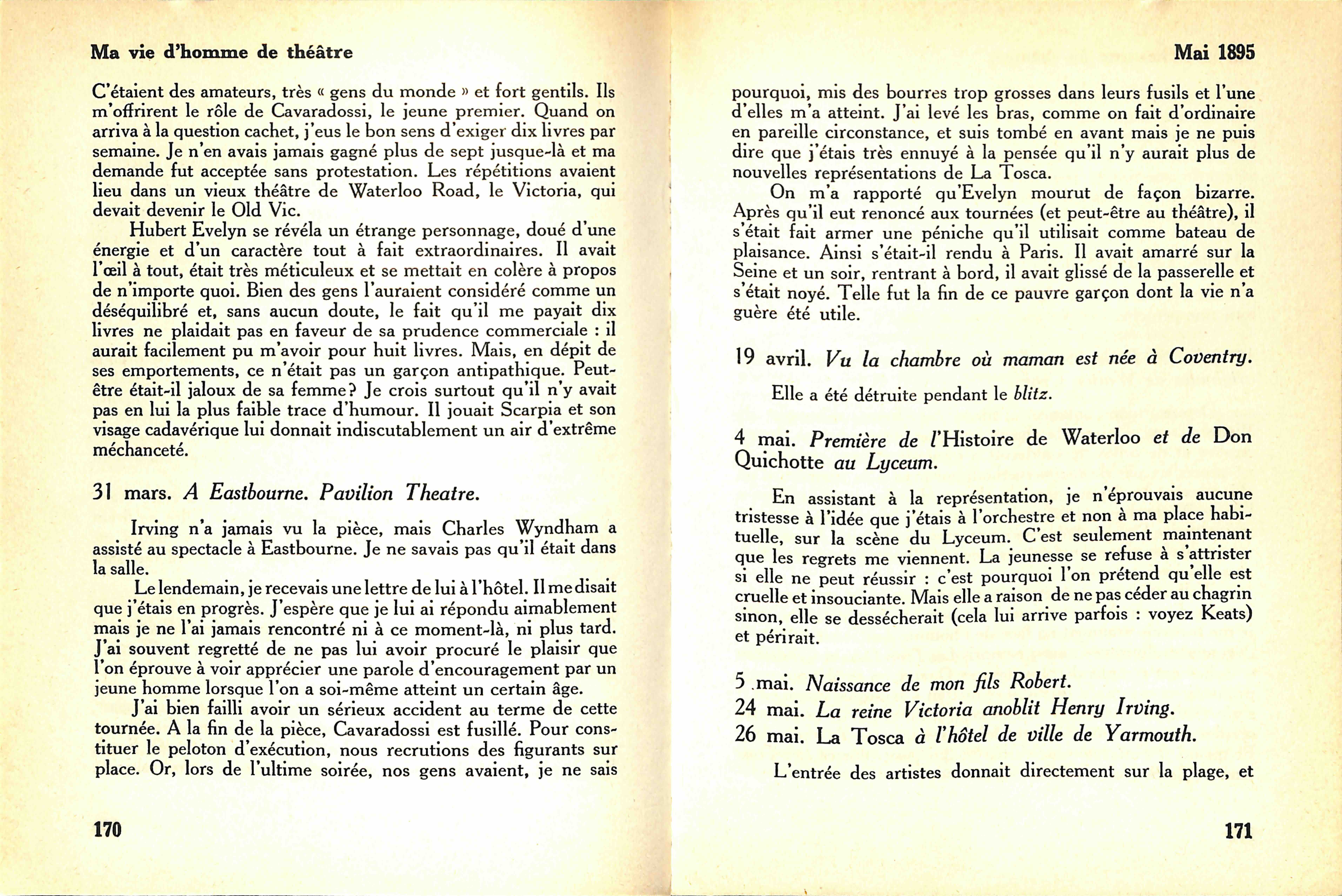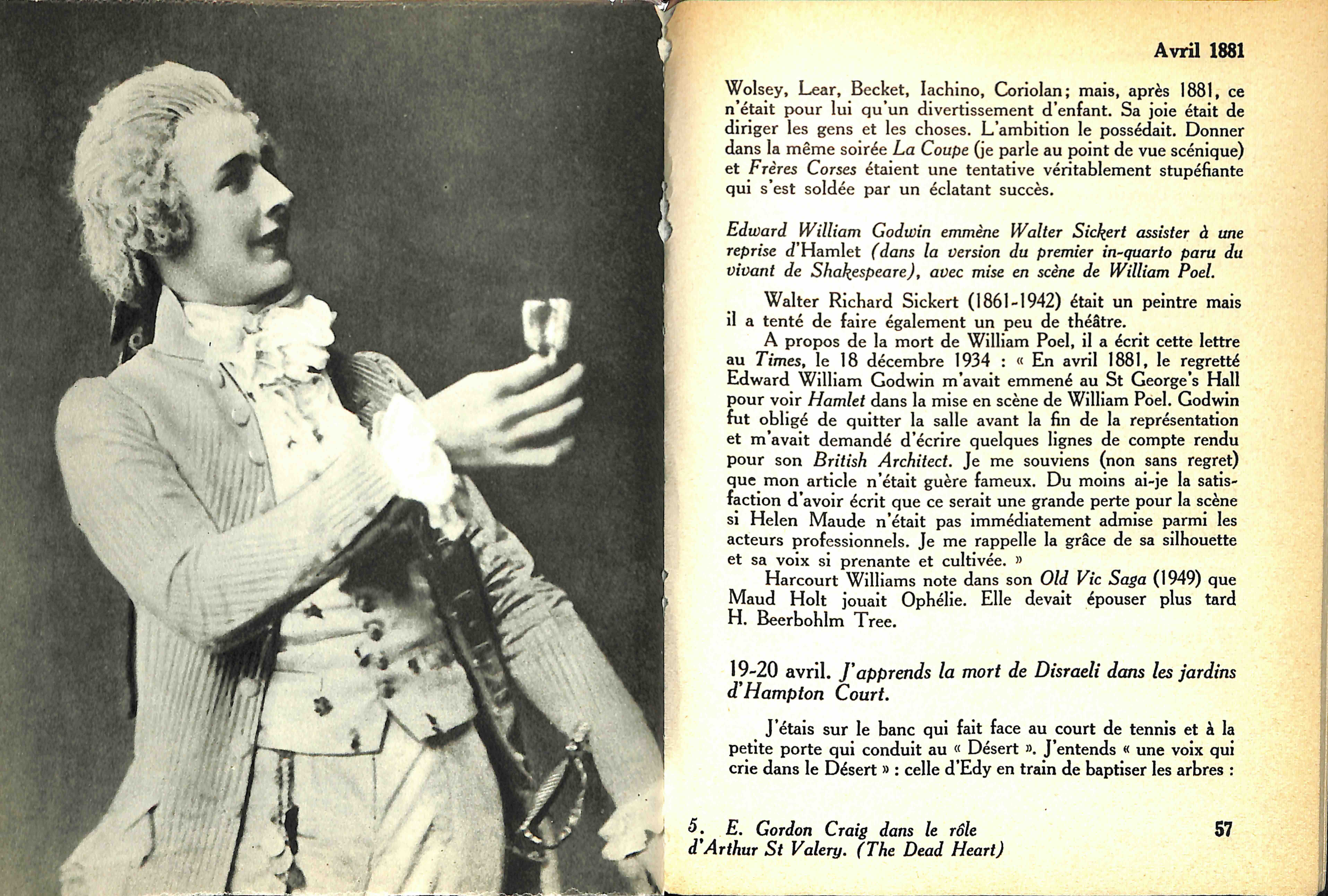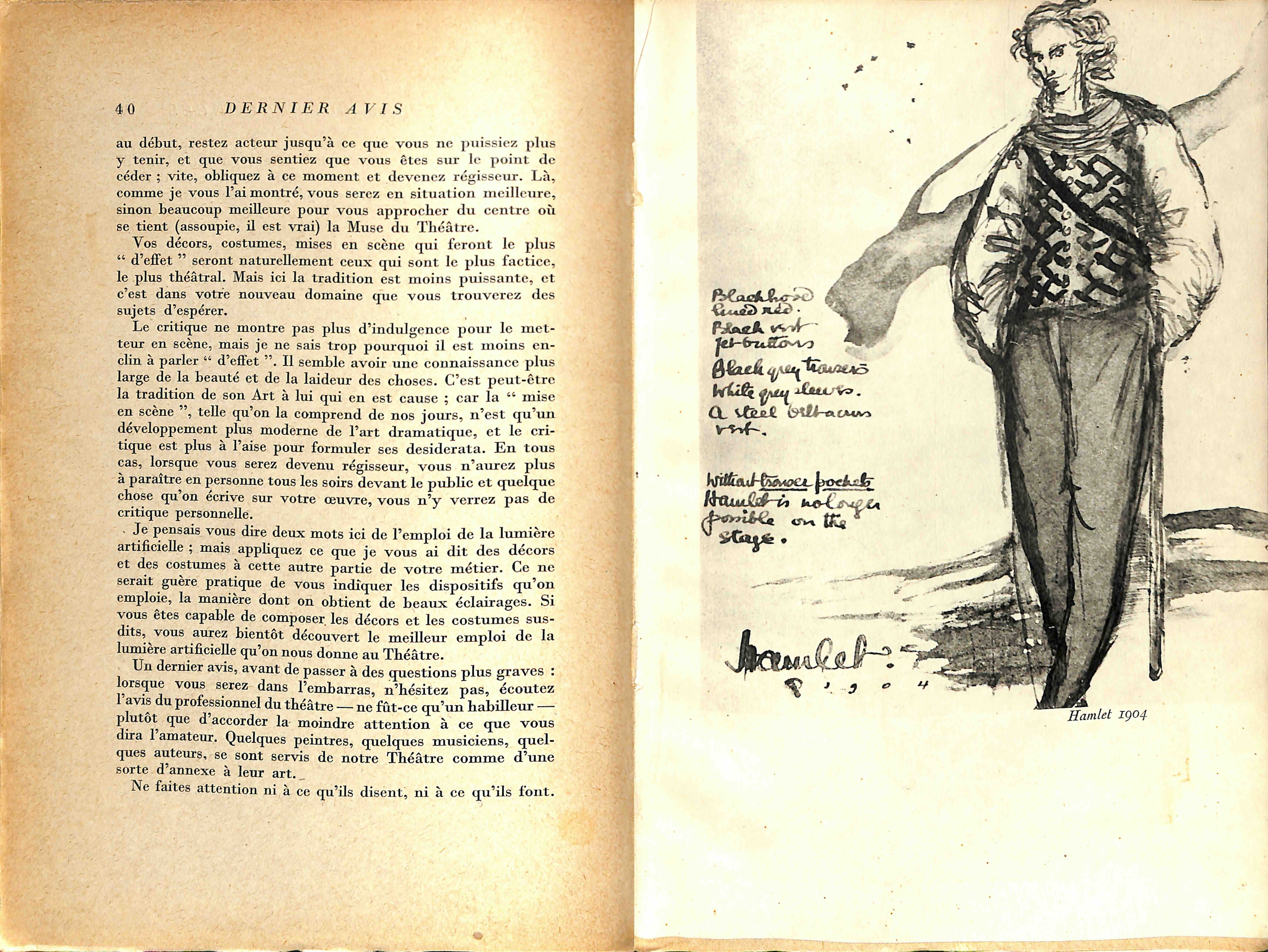 Tel est l'oeuvre. L'homme n'est pas moins extraordinaire. C'est lui surtout qui apparaît dans ses souvenirs : non pas le créateur encore, le prophète, le maître, mais l'adolescent et le chercheur. Et rien n'est plus émouvant que le récit de cette enfance, charmante et attentionnée et déjà distraite et infidèle. Pages sincères et fraîches, comme enveloppées après coup d'un regard tendrement ironique, mais où fulgure parfois l'éclair de la passion. Déjà, en ces années d'apprentissage, Craig s'évadait, s'efforçait de rompre avec les conventions, déjà il cherchait, selon le mot de Copeaux, « a crevé le plafond du temple » et Copeaux rajoutait joliment : « comme depuis il ne l'a pas raccommodé, nous apercevons toujours les étoiles. »