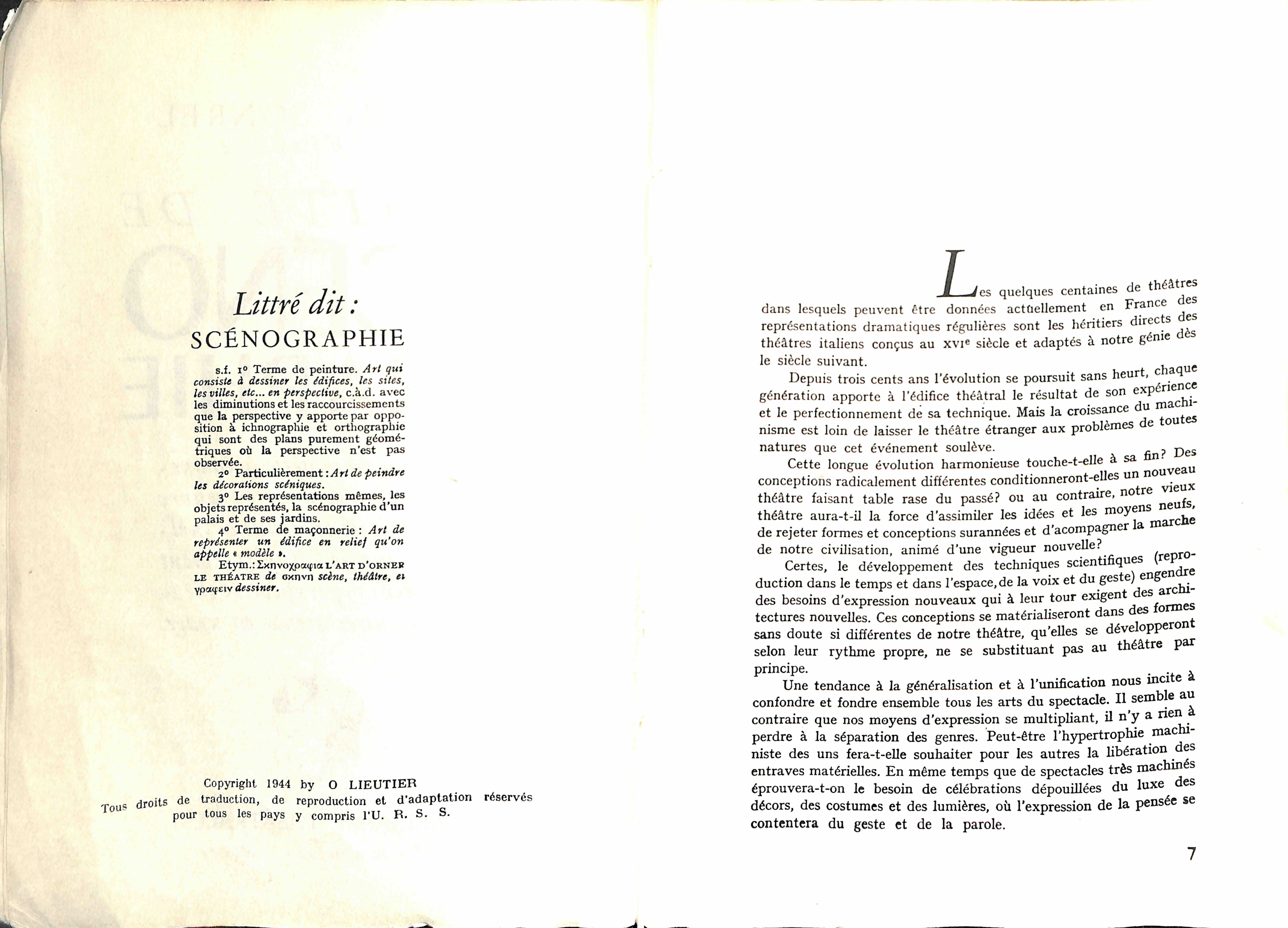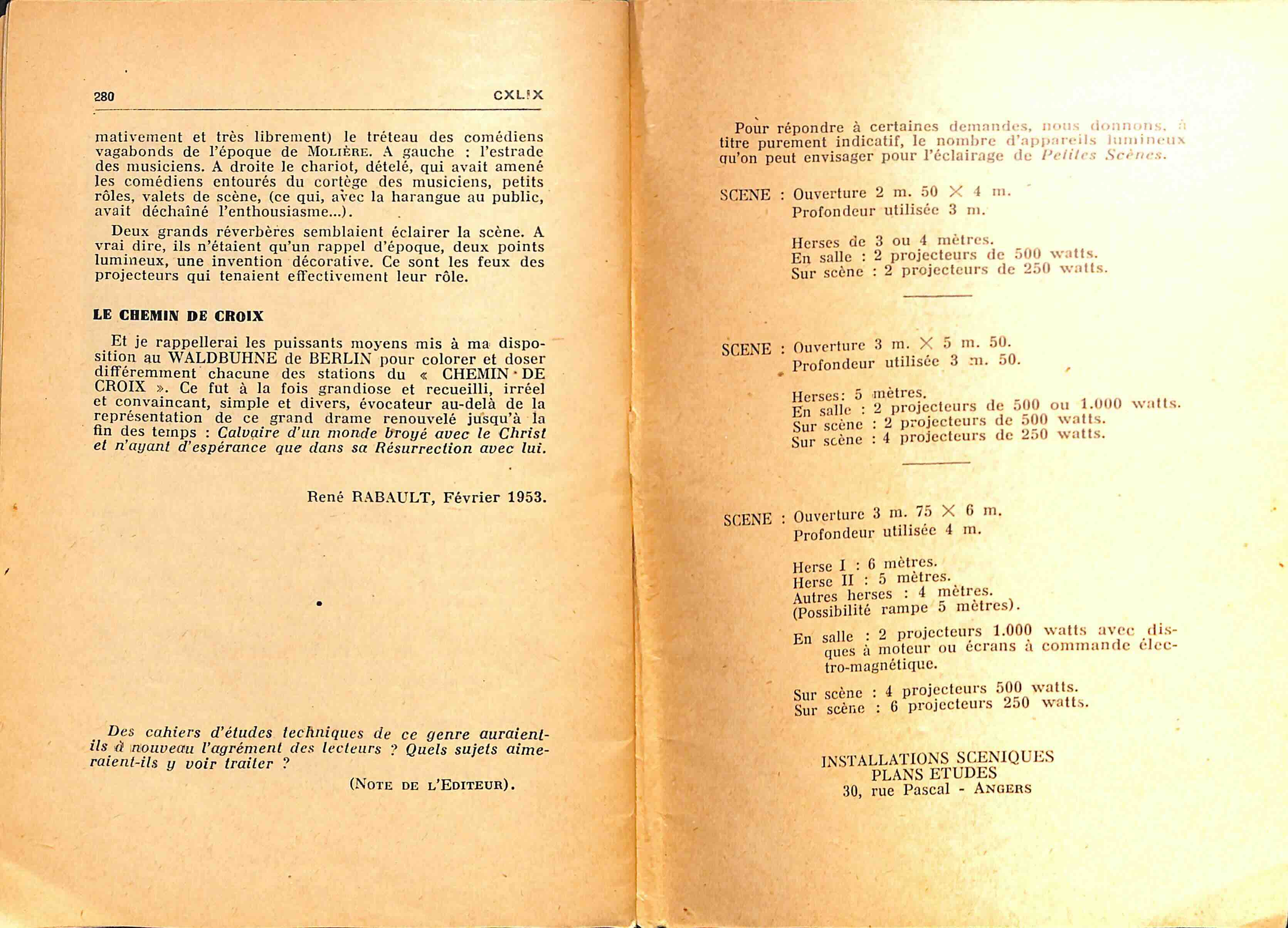 Je sais plutôt d’écrire un guide de l’usager. Ce guide se réfère à l’expérience de nombreuses petites scènes installées sous ma direction et de mes propres mises en scènes. Jean - les exemples qui l’illustreront. Ces mises en scène ont rencontré le succès et l’approbation quasi unanime. Ceci ne veut pas dire que les solutions que je proposerai ce sont les seuls possibles. Au thétre il y a autant de cas différents que des pièces présentées, autant de nuances dans la représentation qu’il y a de mise en scène et autant d’interprétations qu’il y a de comédien. C’est le caractère même de notre Art. Sa puissance de diversité conditionne son potentiel d’universalité.