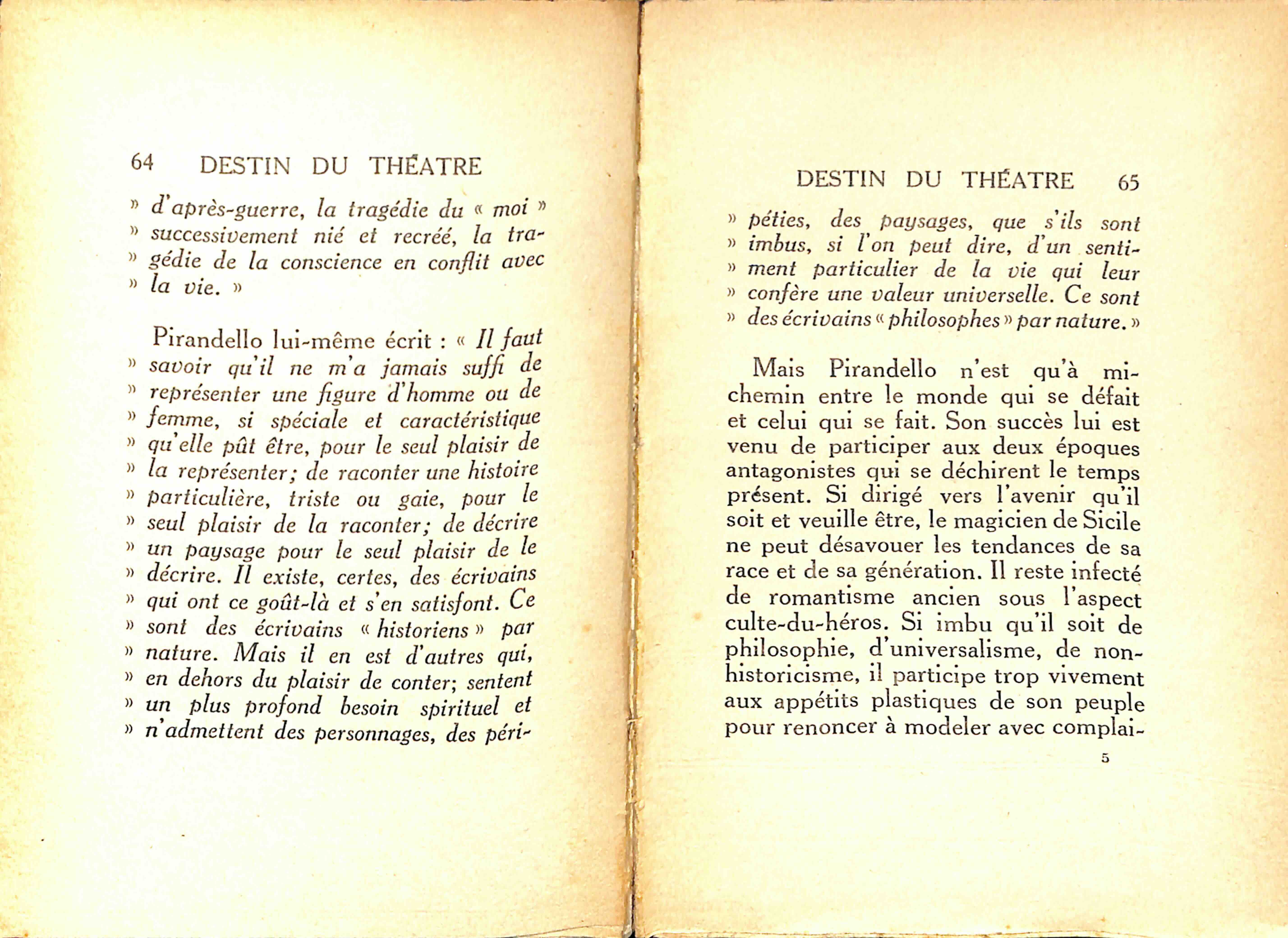 Faut-il incriminer le talent ? Serait-il en baisse ? Cela est difficile à croire, serait difficile à expliquer. Les concours du Conservatoire donnent souvent de grands espoirs, aujourd'hui comme autrefois, et les directeurs découvrent toujours, de temps à autre, dans la masse des petits acteurs faméliques, des sujets hors ligne. Toutefois, aucun d'eux n'atteint plus à la vraie renommée, à une expression triomphale de sa personnalité. Il doit y avoir une cause à cela. Il leur manquerait-il pas l'essentiel de ce qu'exige une réussite théâtrale éclatante, l'accord complexe de l’œuvre, de l'interprète et du public ?
