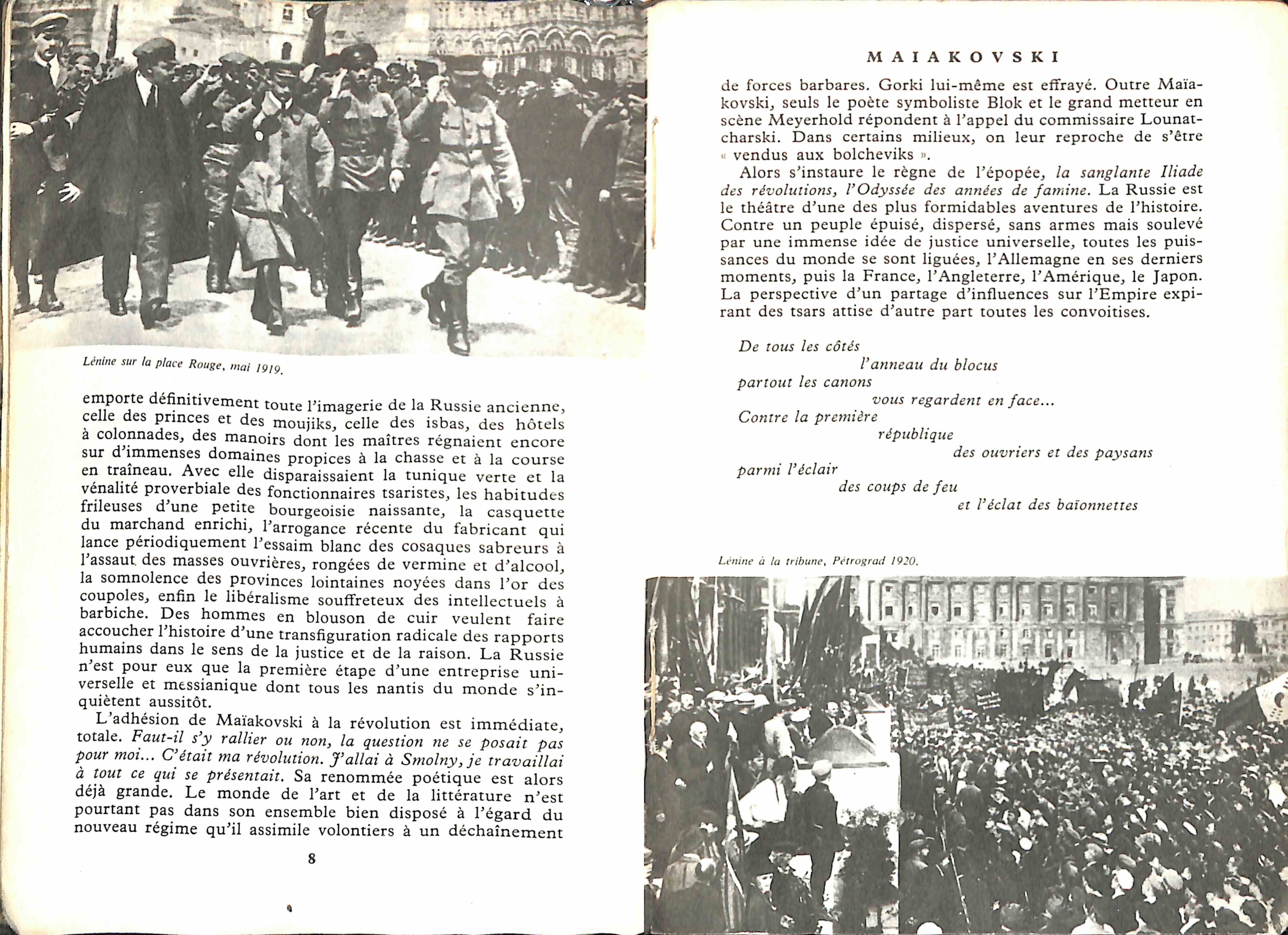 On ne peut parler d’Mune brusque rencontre du poète russe Maïakovski et de la révolution soviétique qu’il aurait, au milieu de sa carrière, soudainement transformé en barde officiel du régime socialiste. « La nouveauté des temps était le climat même de son sens », dit Pasternak. La révolution est, plus encore qu’une option, un tempérament, une manière de vivre, comme le contexte ininterrompu est nécessaire de toute son existence. Dès qu’il quitte les montagnes de son enfance, le grand air, les rochers, les forêts, les lourds fruits mrs de Géorgie, il se heurte au cosaque qui répriment les manifestations de 1905. ICEA dans un petit chef-lieu provincial, à 12 ans il court dans les rues avec les grévistes, reçoit des coups, lit des brochures marxistes, apprend des champs de combat. La révolution et les vers se sont d’une certaine manière confondue dans ma tête.