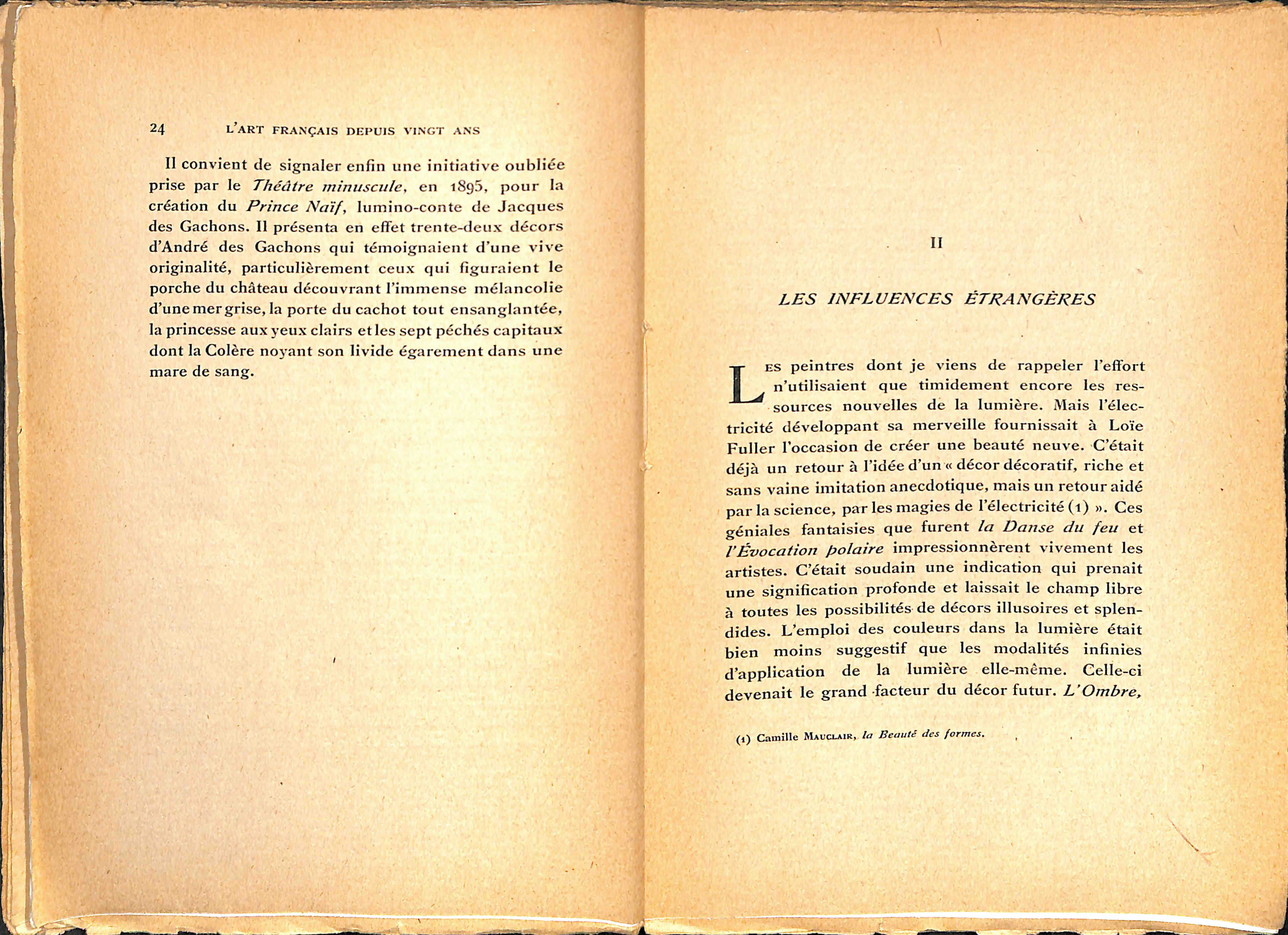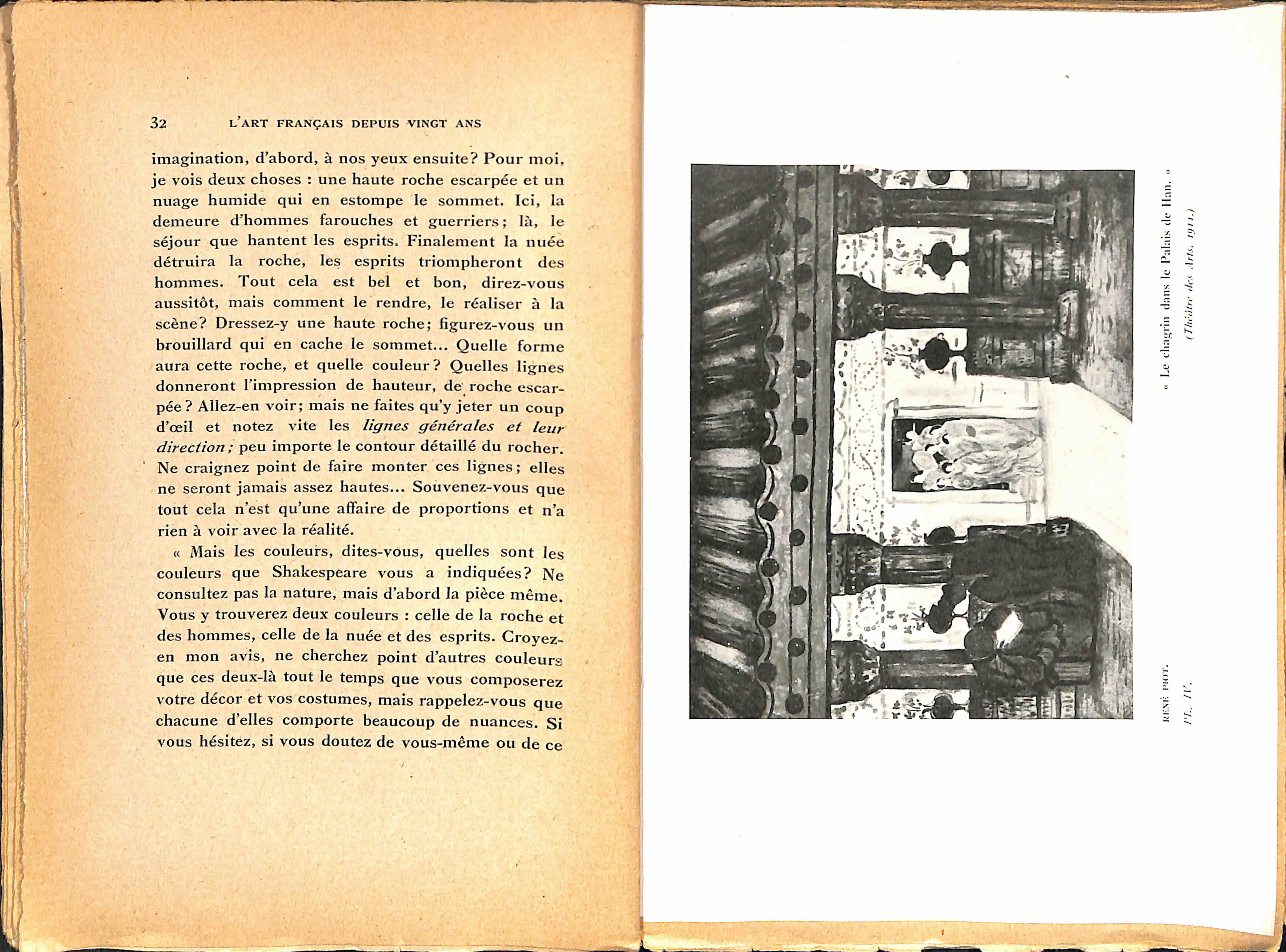 C’est pourquoi j’ai surtout voulu, dans cet essai, donner une idée d’ensemble de l’évolution de la décoration théâtrale depuis le temps où, par réaction contre le réalisme à la scène, on essaya d’obtenir l’unité artistique en demandant à des peintres de composer des décors et des costumes en harmonie avec l’esprit et le sens de l’oeuvre à représenter.