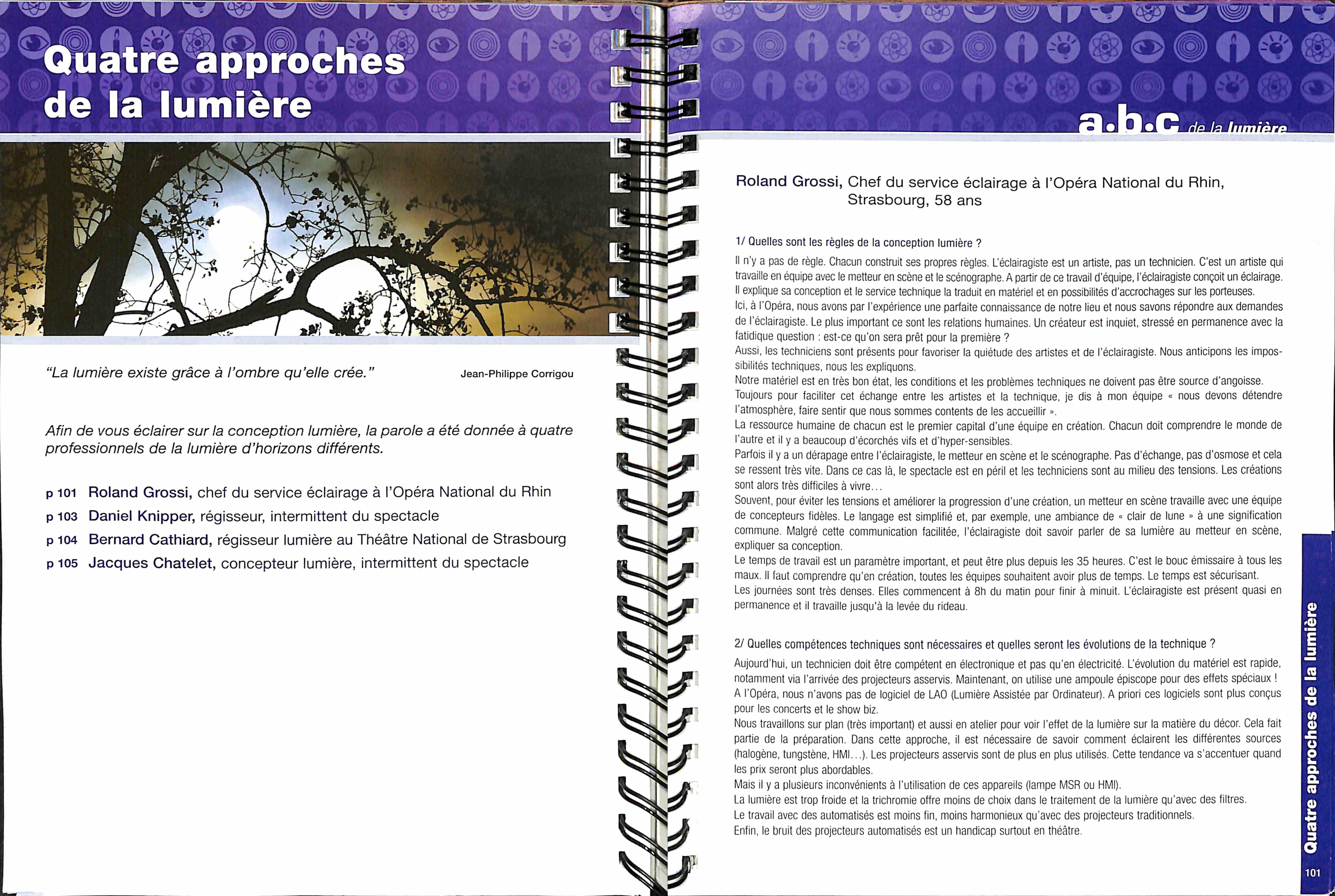 Le métier d'éclairagistes ne s'apprend qu'au contact de spécialistes, sur le terrain. L'expérience et le doigté ne se grave pas sur CD-ROM et ne s'imprime pas sur papier, mais ce livre contribuera à développer les talents d'éclairagiste à ceux qui le liront, amateurs ou professionnels. Il sera leur compagnon sur le chemin plein d'imprévus des innombrables possibilités offertes par les techniques numériques de commandes de lumière.