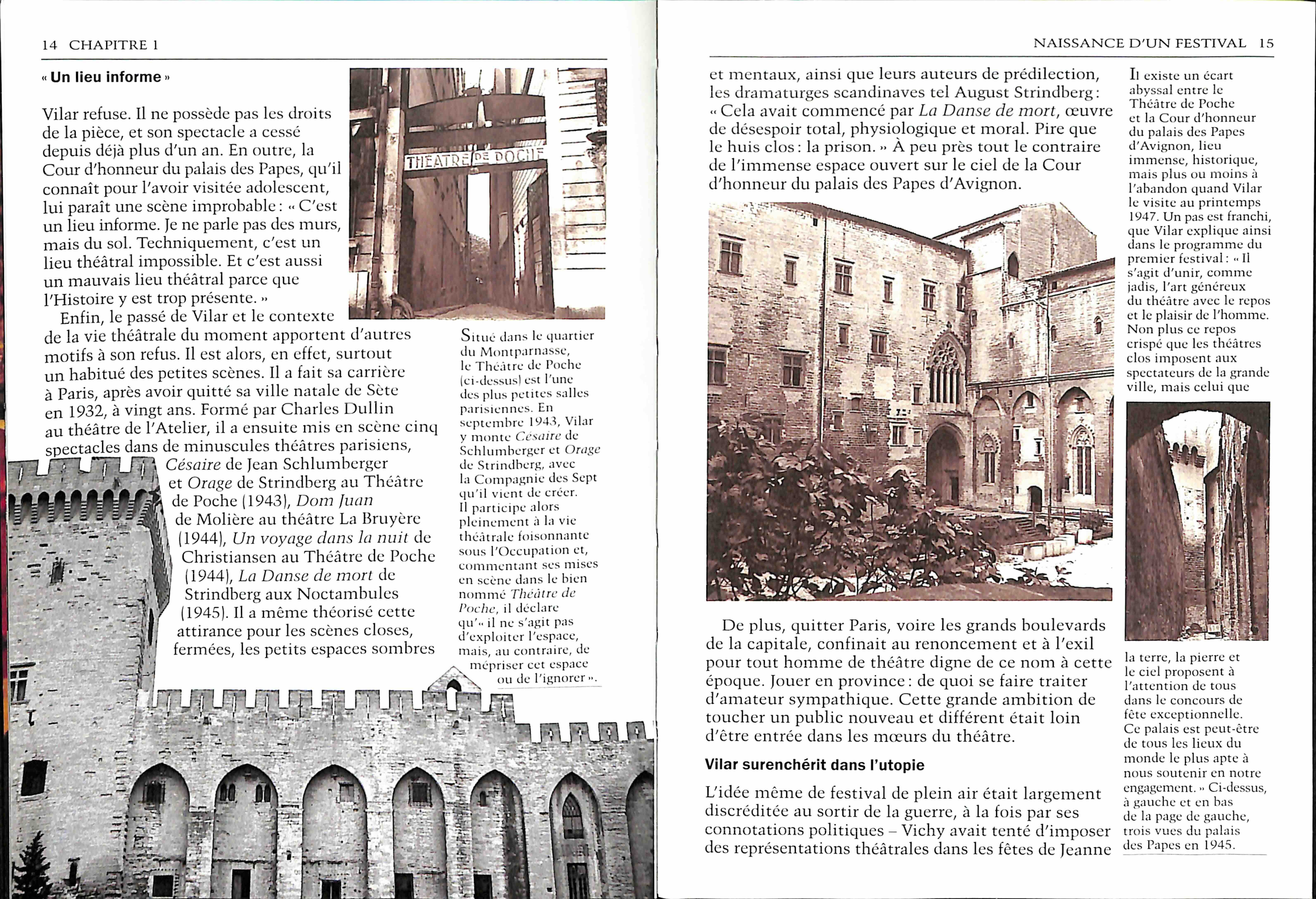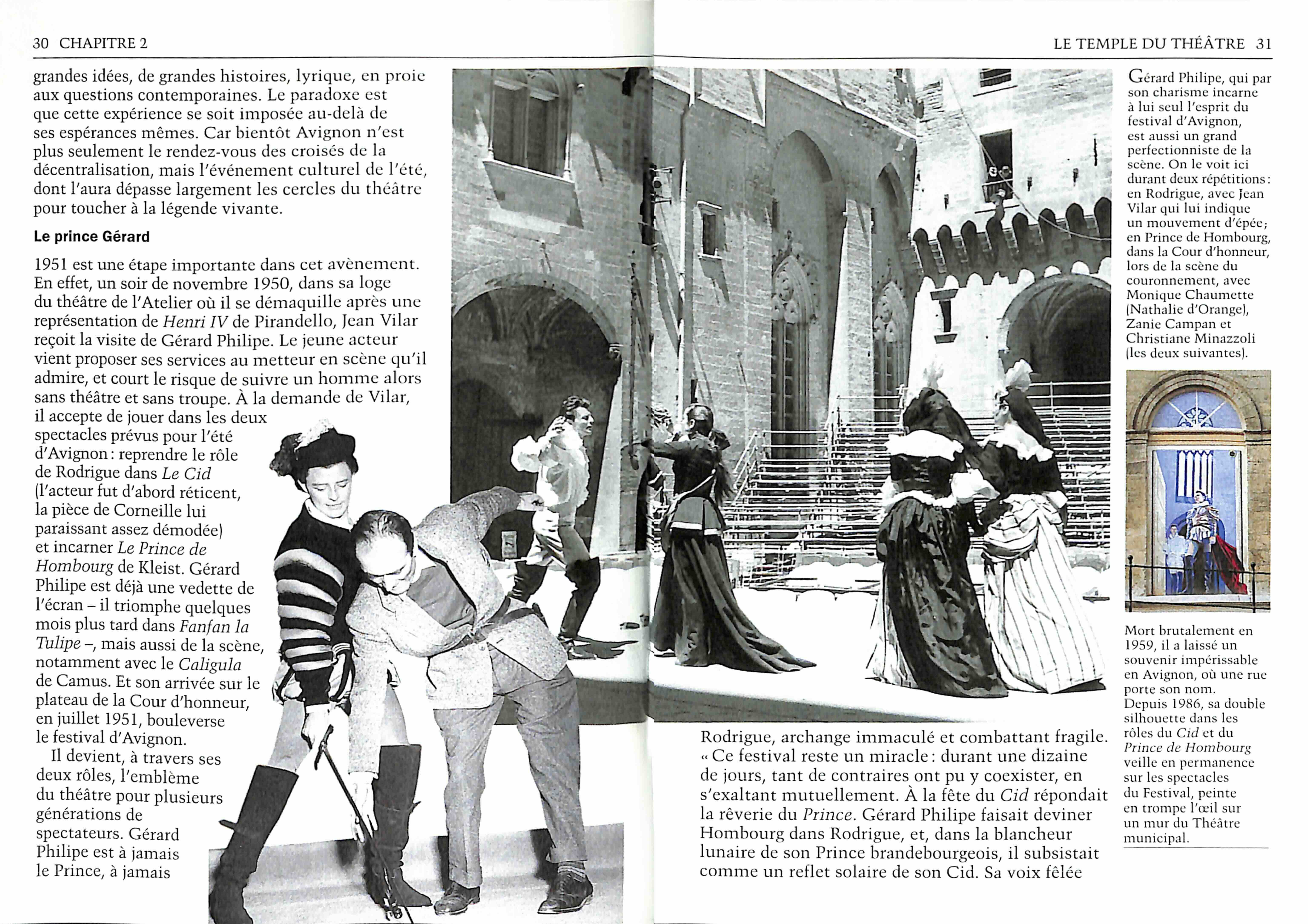 « Le temple du théâtre »Porté par son fondateur, le festival d'Avignon devient le symbole du renouveau théâtral, attirant un public sans cesse plus nombreux. Promu en 1951 à la tête du Thétre national populaire, Jean Vilar installe chaque été sa troupe en Avignon et met en scène Gérard-Philipe dans le CID et le Prince de Hombourg. pg26