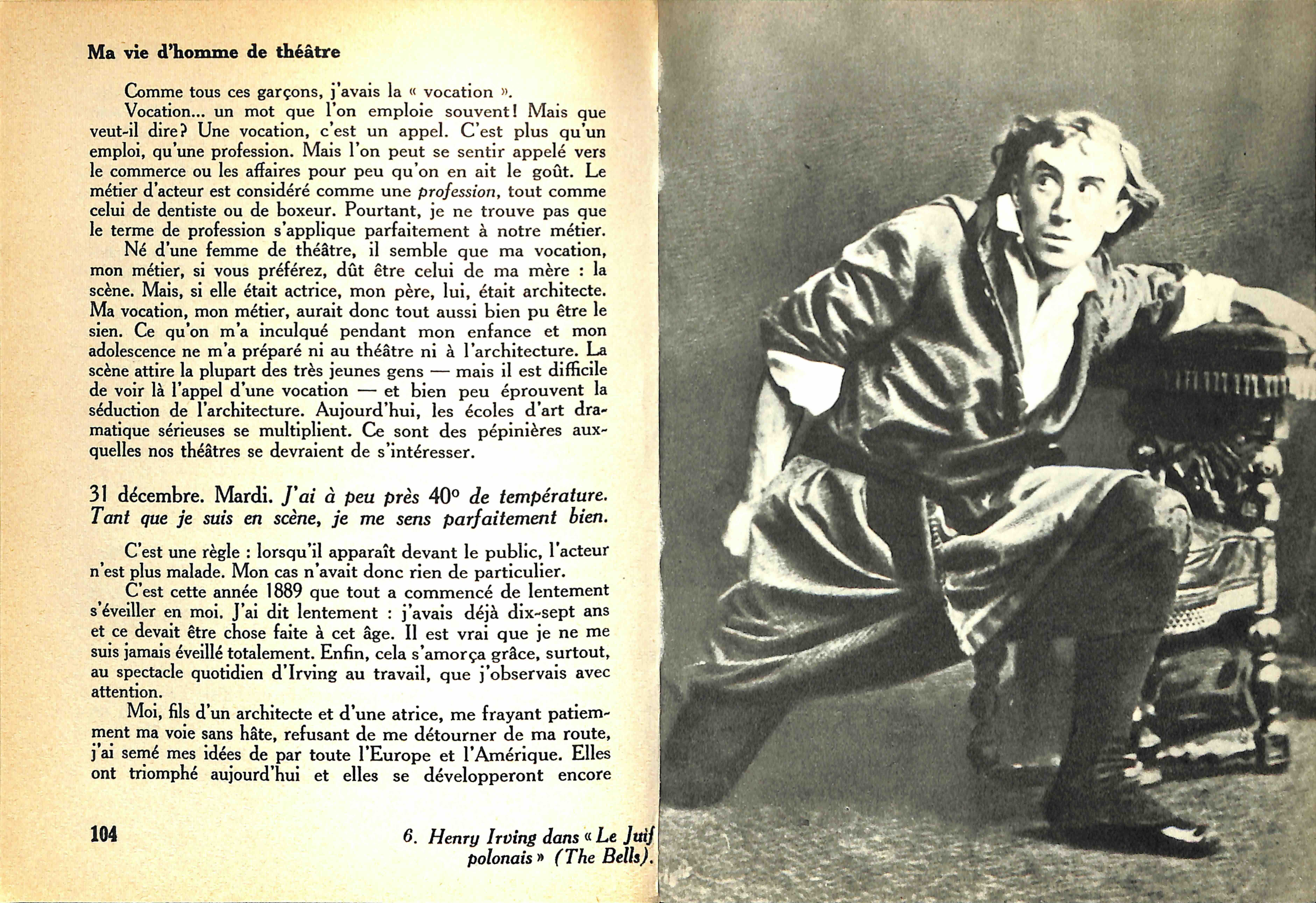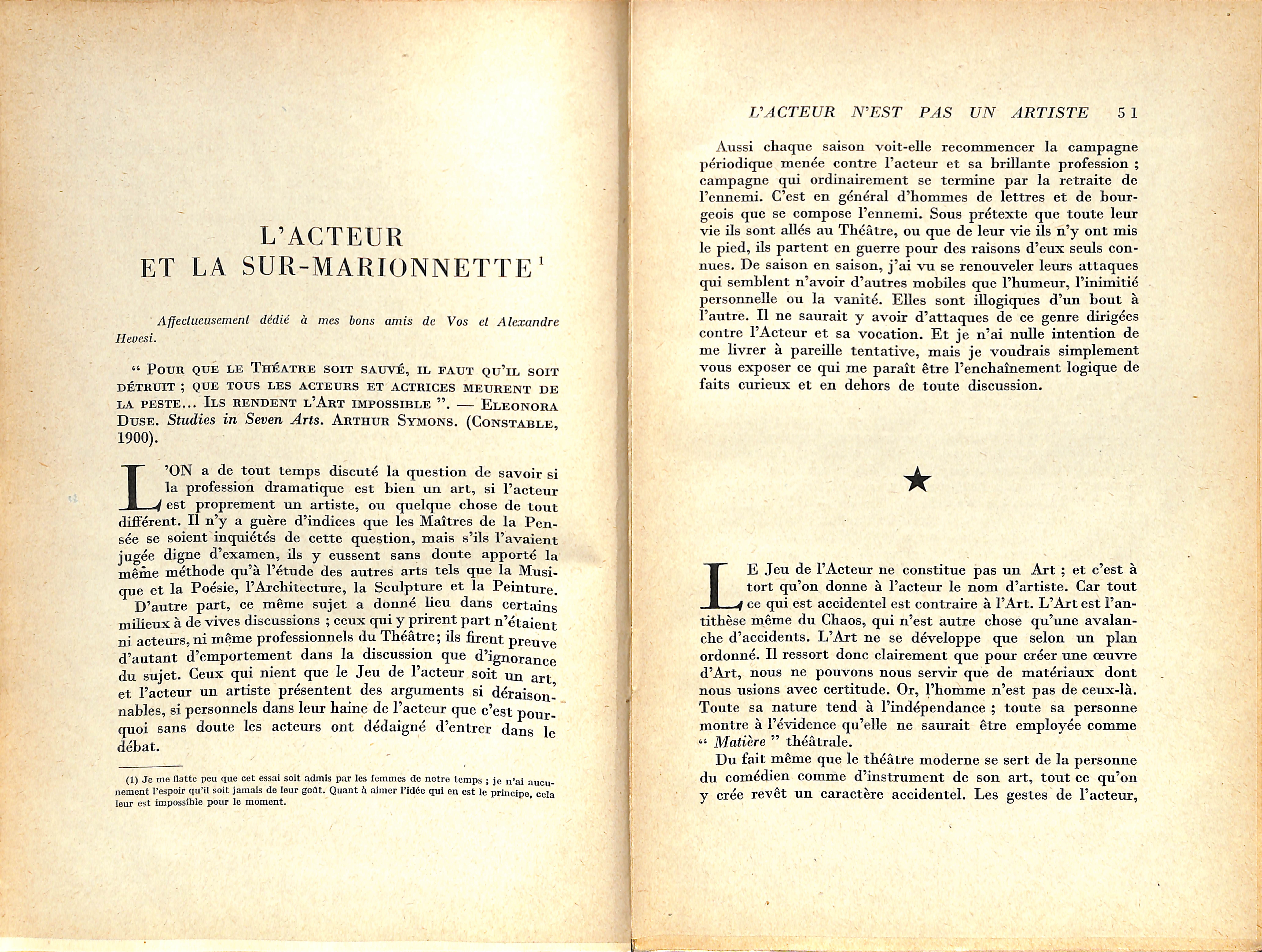 Tel est l'oeuvre. L'homme n'est pas moins extraordinaire. C'est lui surtout qui apparaît dans ses souvenirs : non pas le créateur encore, le prophète, le maître, mais l'adolescent et le chercheur. Et rien n'est plus émouvant que le récit de cette enfance, charmante et attentionnée et déjà distraite et infidèle. Pages sincères et fraîches, comme enveloppées après coup d'un regard tendrement ironique, mais où fulgure parfois l'éclair de la passion. Déjà, en ces années d'apprentissage, Craig s'évadait, s'efforçait de rompre avec les conventions, déjà il cherchait, selon le mot de Copeaux, « a crevé le plafond du temple » et Copeaux rajoutait joliment : « comme depuis il ne l'a pas raccommodé, nous apercevons toujours les étoiles. »