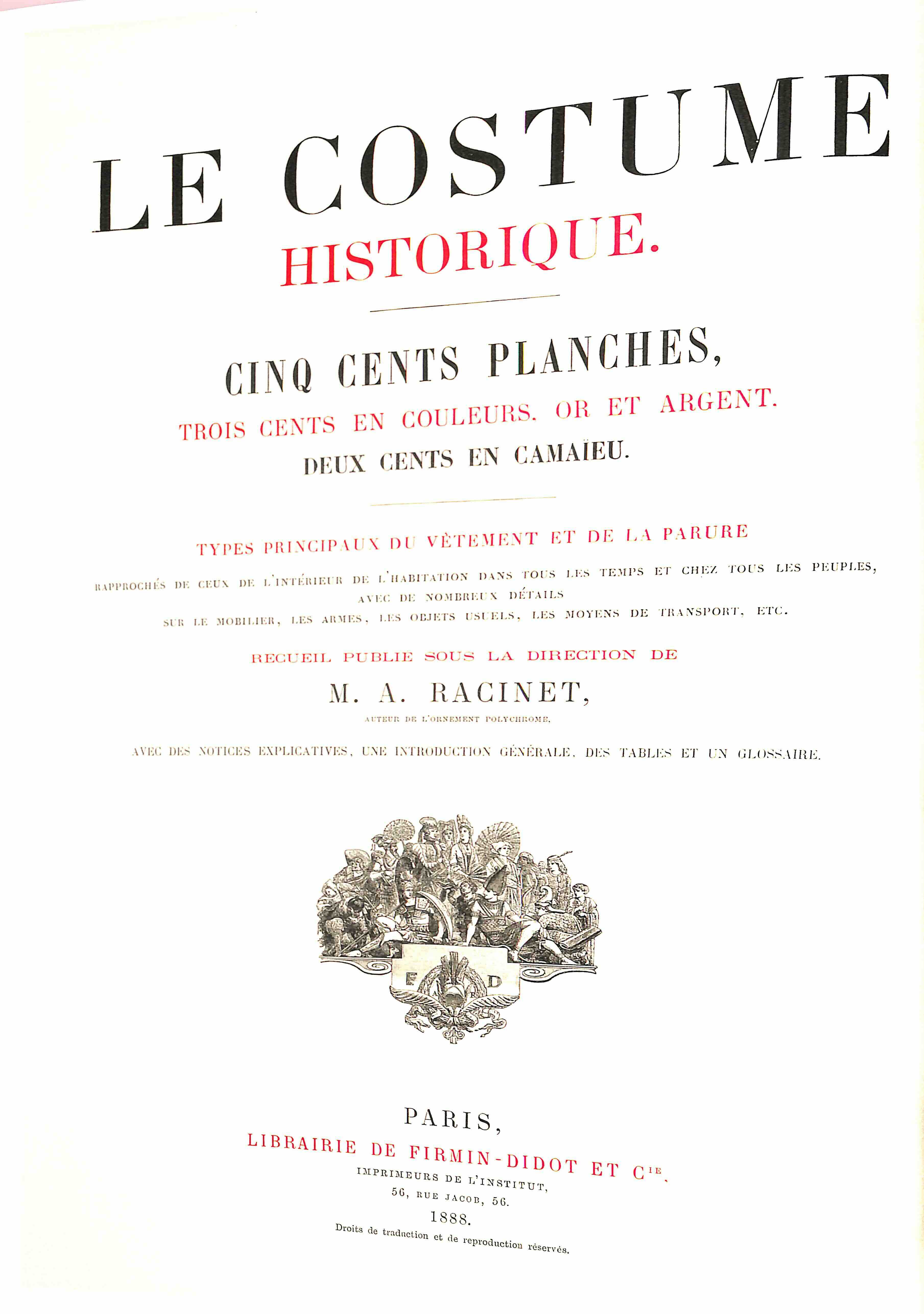 - Auguste Racinet « Costume Historique », Françoise Tétart-Vittu. pg8Auguste Racinet « Le Costume Historique », Françoise Tétart-Vittu. pg12« Le Costume Historique » d’Auguste Racinet, Françoise Tétart-Vittu. pg16PlanchesI - Le monde antique. pg20II - Le monde en dehors de l’Europe. pg76III - L’Europe 400 - 1800. pg198IV - Costumes traditionnels jusqu’à la fin du XIXe siècle. pg426V - Coupes et patrons. pg536Bibliographie. pg544