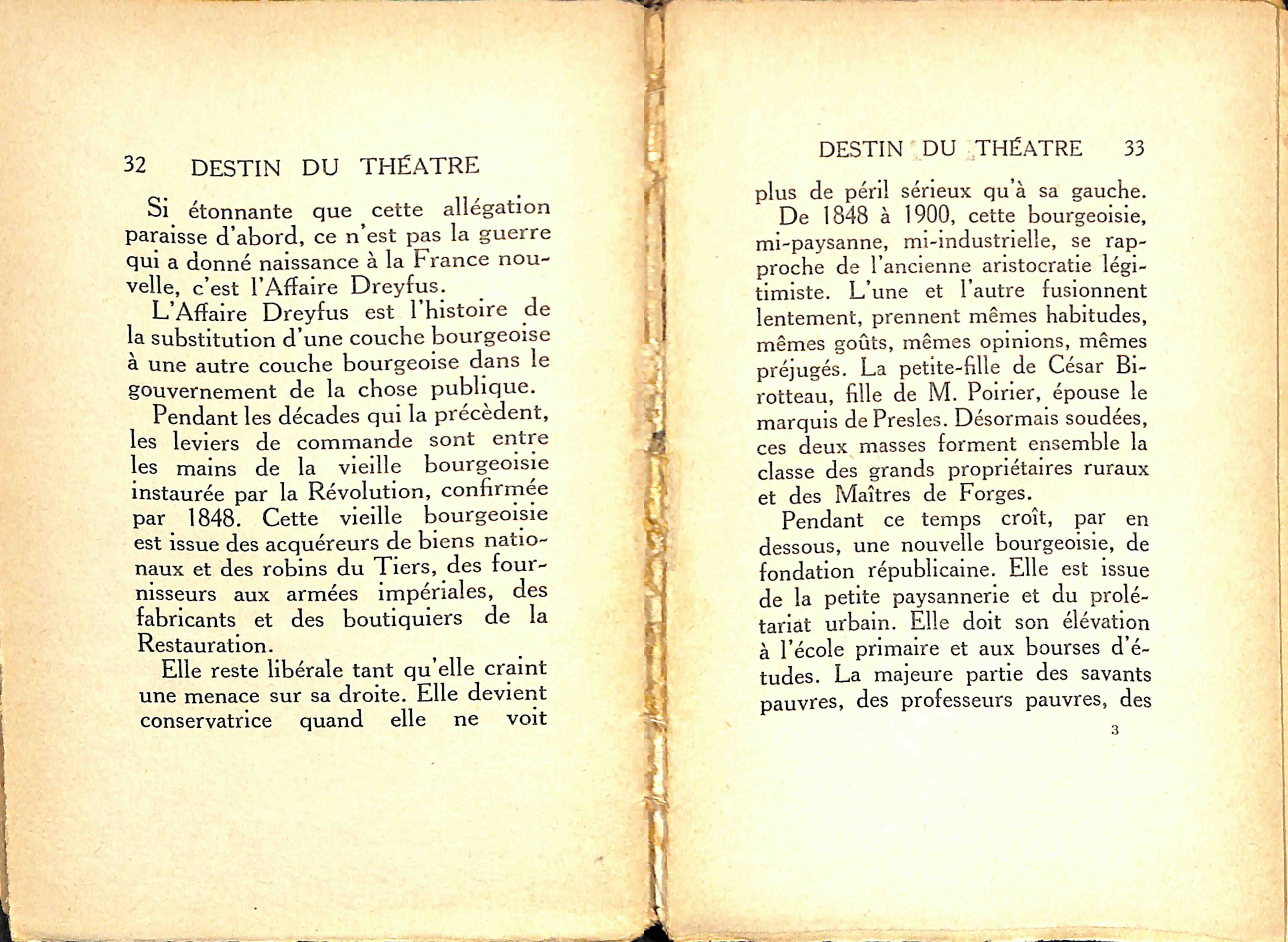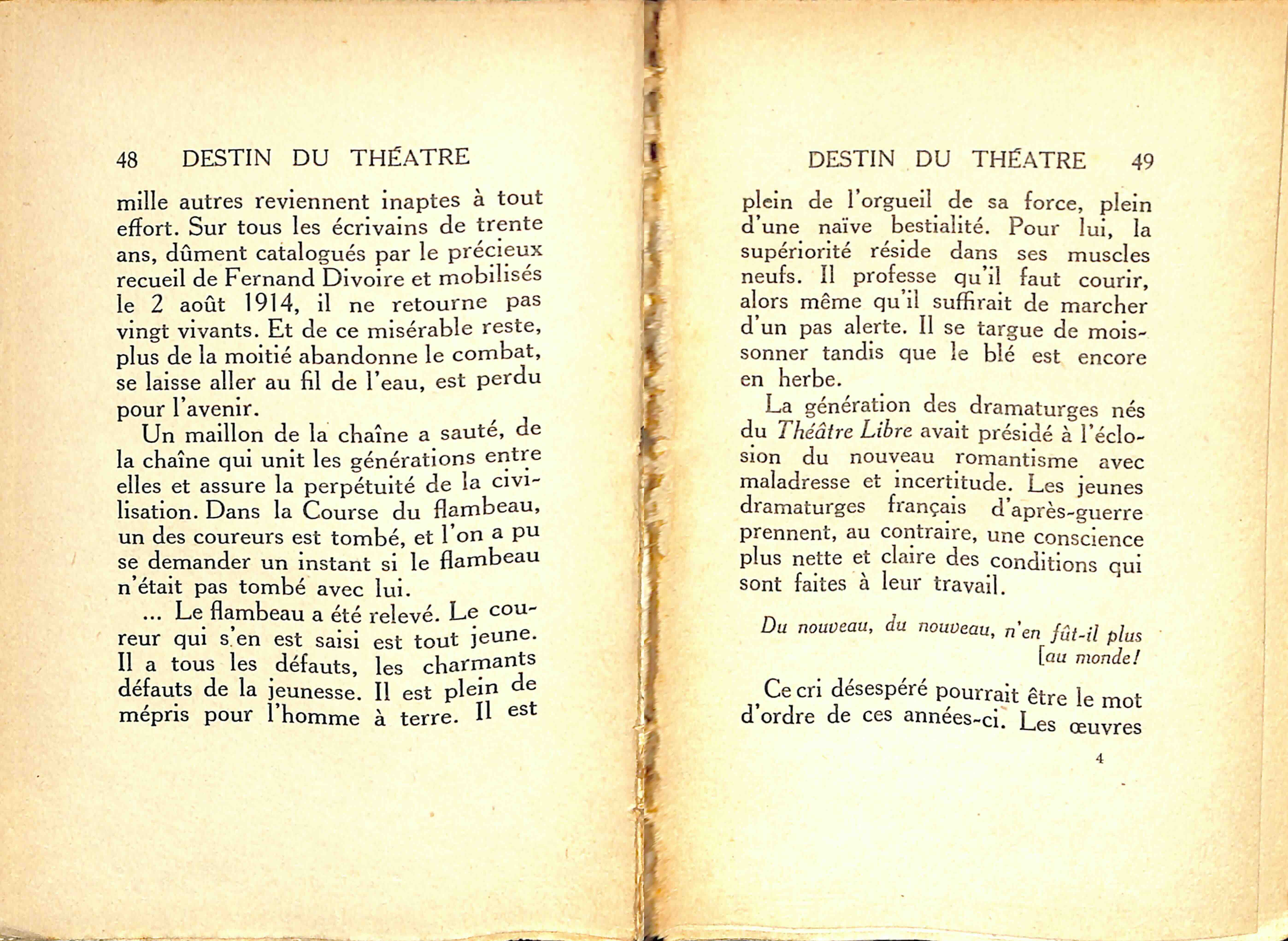 Faut-il incriminer le talent ? Serait-il en baisse ? Cela est difficile à croire, serait difficile à expliquer. Les concours du Conservatoire donnent souvent de grands espoirs, aujourd'hui comme autrefois, et les directeurs découvrent toujours, de temps à autre, dans la masse des petits acteurs faméliques, des sujets hors ligne. Toutefois, aucun d'eux n'atteint plus à la vraie renommée, à une expression triomphale de sa personnalité. Il doit y avoir une cause à cela. Il leur manquerait-il pas l'essentiel de ce qu'exige une réussite théâtrale éclatante, l'accord complexe de l’œuvre, de l'interprète et du public ?